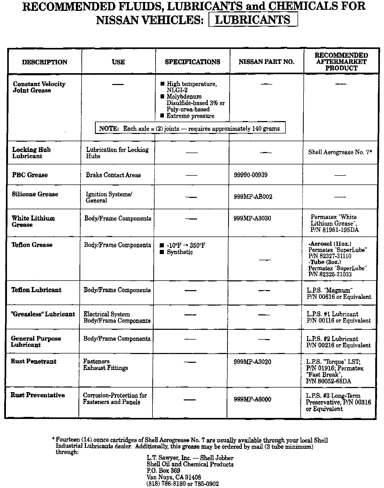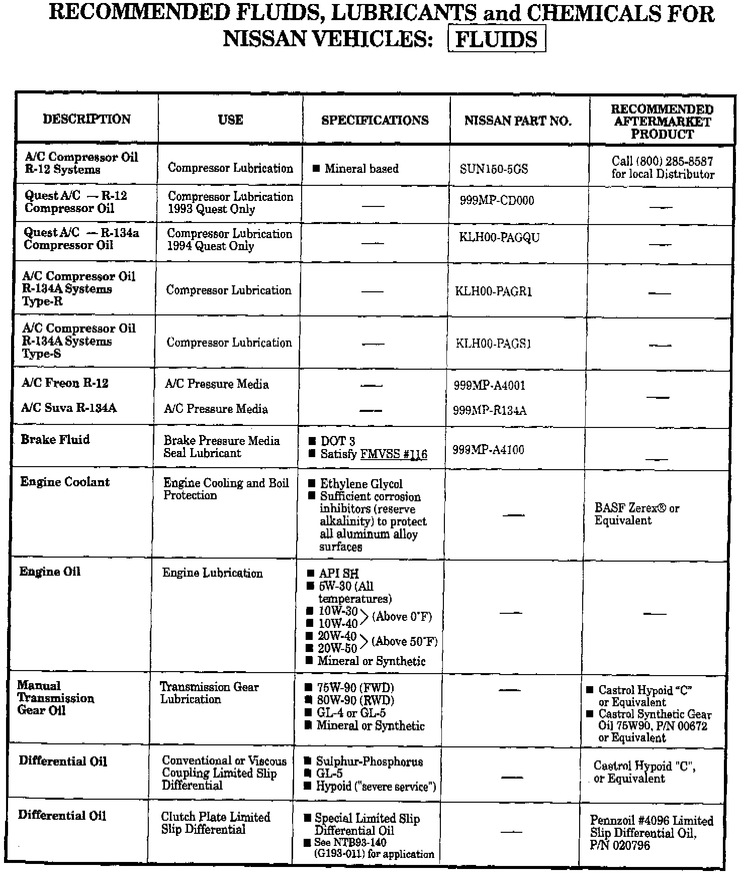 RECOMMENDED FLUIDS, LUBRICANTS, and CHEMICALS FOR NISSAN VEHICLES