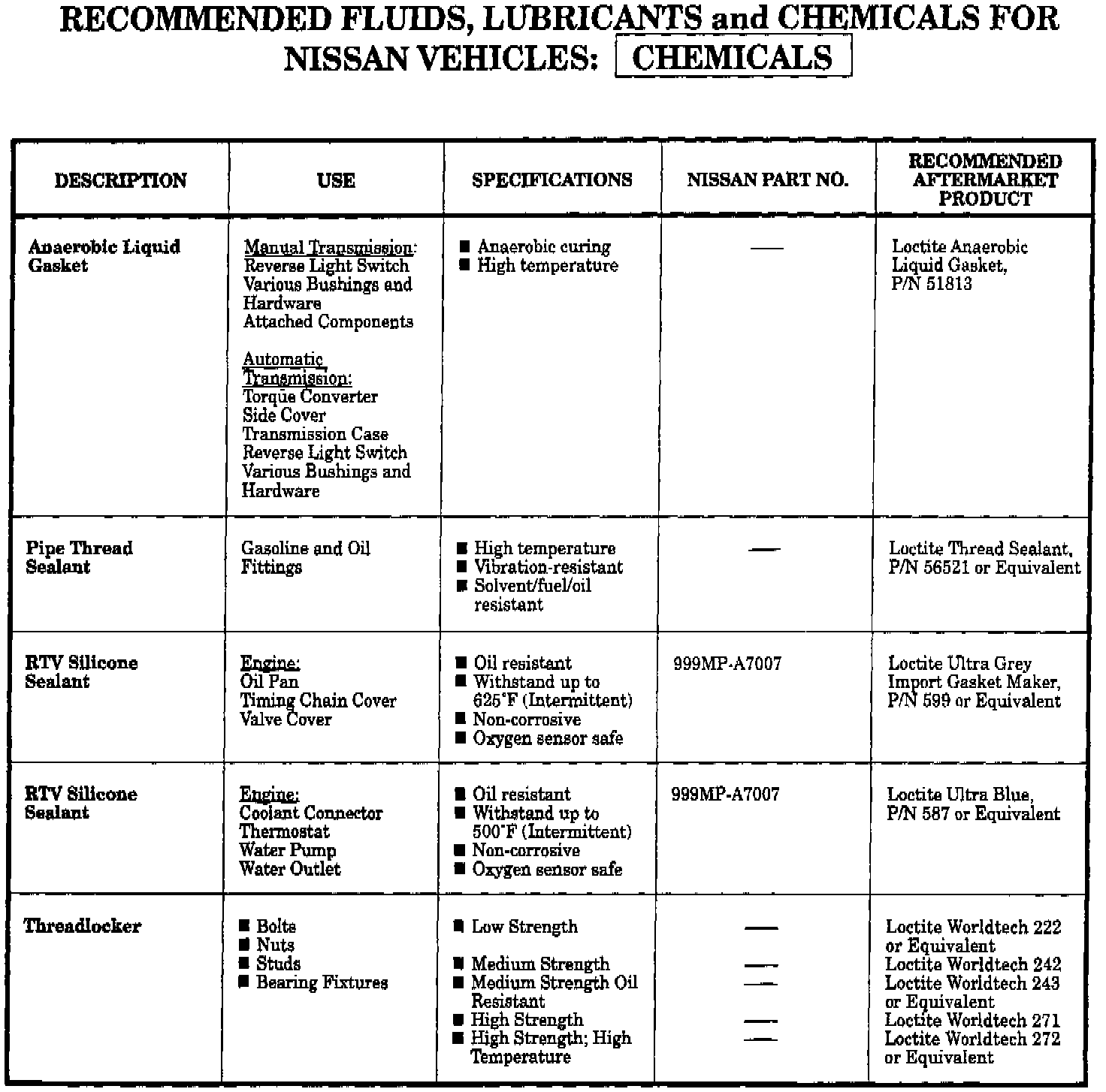 In some cases, a Non-Nissan chemical product has been identified which is equivalent to the Factory product in application, material compatibility, temperature range, and solvent-resistance.