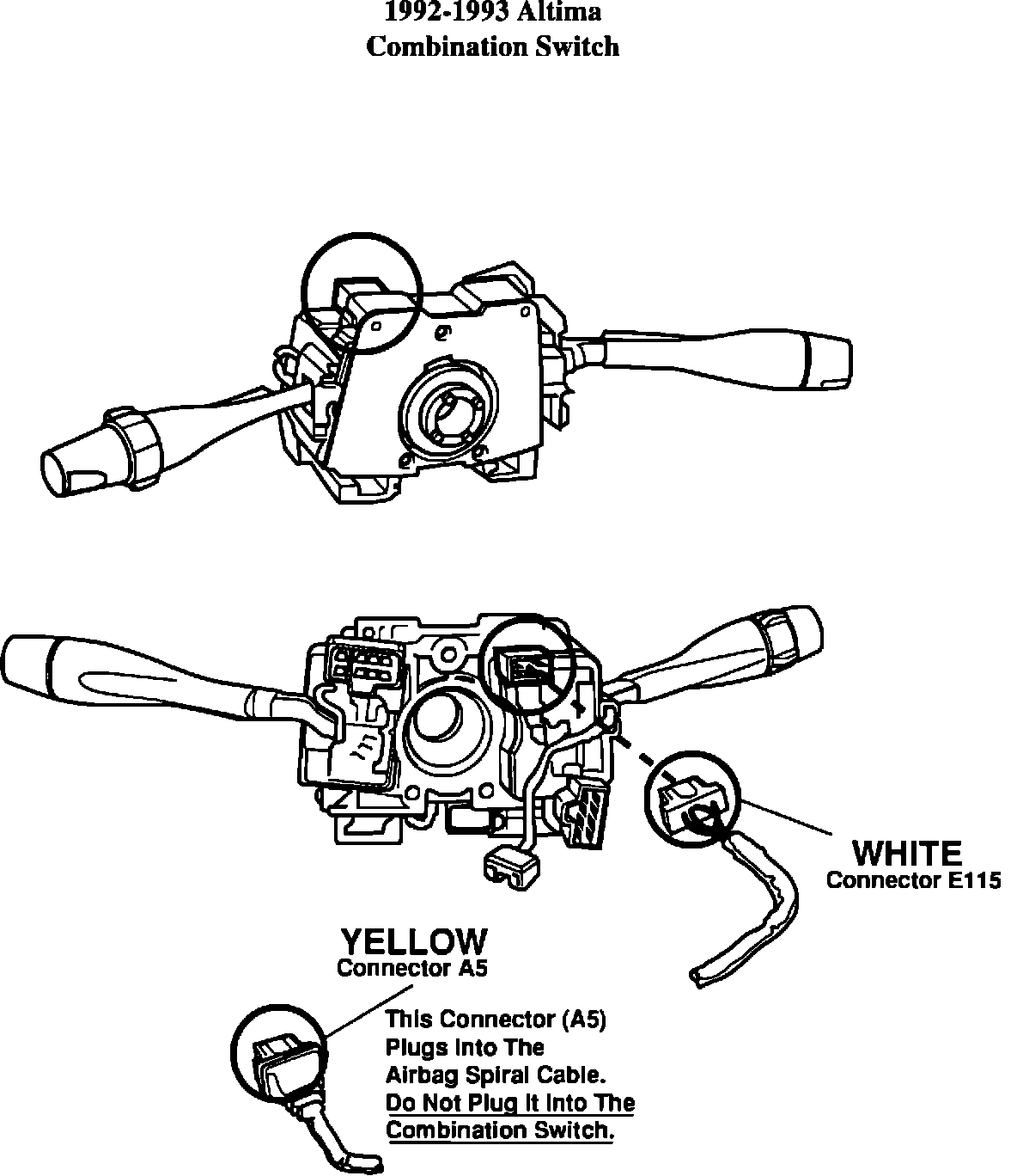 Use caution when replacing the combination switch on any Altima vehicle. On re-assembly, make sure all connectors are re-connected correctly. An incorrect connection could lead to an unintended deployment of the airbag. Specifically, do not interchange connector E1 15 (turn signal circuit) with connector A5 (SRS Airbag circuit). Connector E1 15 connects into the turn signal switch on the combination switch. Connector A5 connects into the spiral cable for the SRS Airbag system.