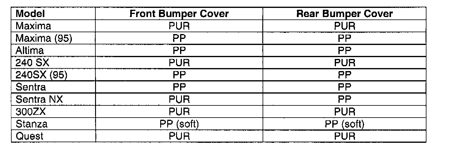 The bumper cover can be identified by the letters PUR or PP stamped on the back of the cover.