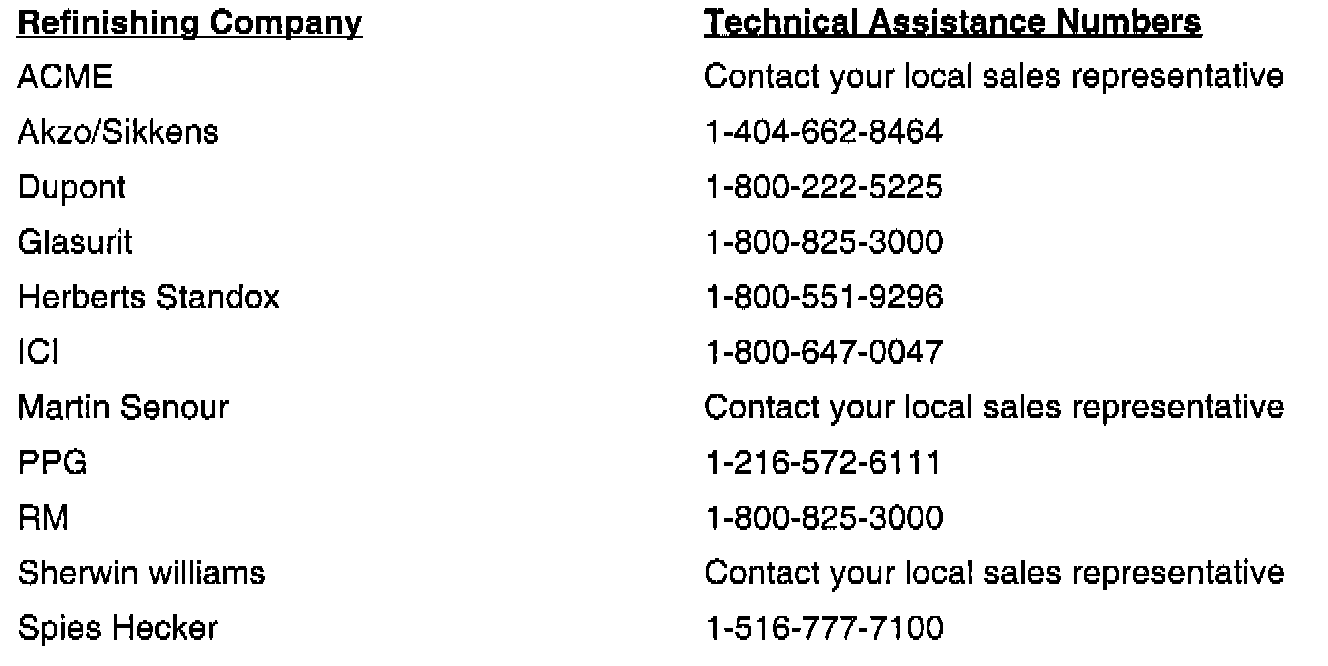 The procedures and appropriate materials for each paint vendor is attached for your reference. If you should have any difficulty obtaining materials, following the published procedure or are unable to obtain a proper refinish you can contact the paint refinish companies' technical assistance number listed.