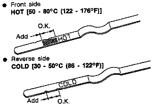 Fluid level should be checked using "HOT" range on dipstick at fluid temperatures of 50 to 80°C (122 to 1 76°F) after vehicle has been driven approximately 5 minutes in urban areas and engine is warmed up. It can be checked at fluid temperatures of 30 to 50°C (86 to 1 220 F) using "COLD" range on dipstick for reference after engine is warmed up and before drving. However, fluid level must be rechecked using "HOT" range.
