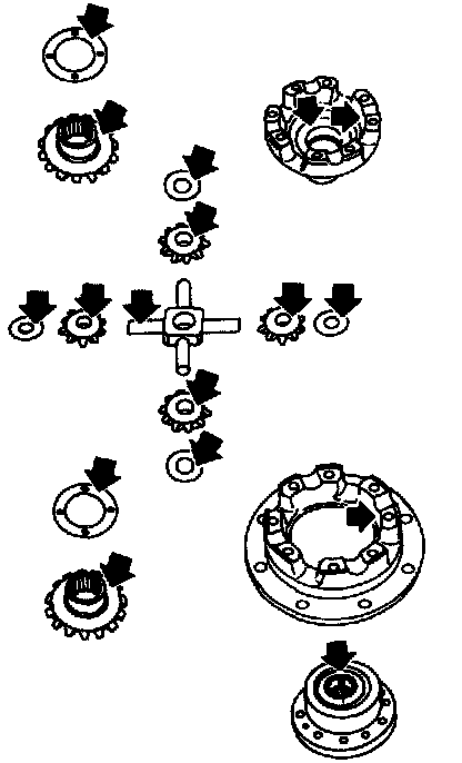 - Check mating surfaces of differential case, side gears, pinion mate gears and viscous coupling.