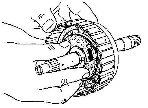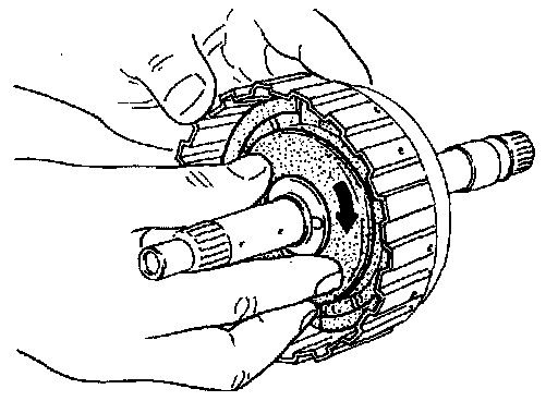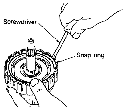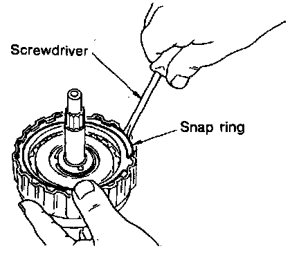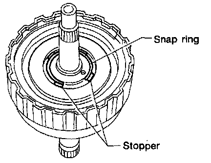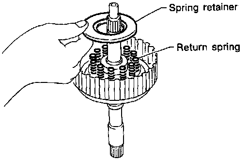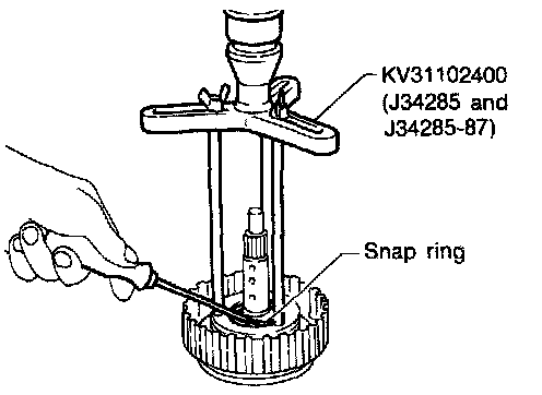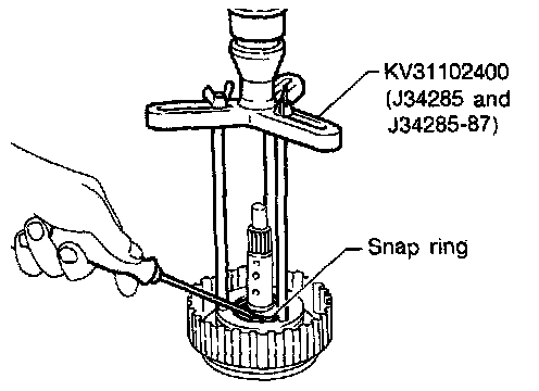 5. Set Tool on spring retainer and remove snap ring from high clutch drum while compressing return springs.