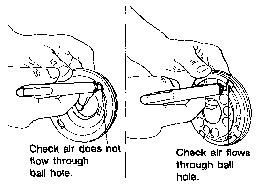 - Apply compressed air to oil hole on return spring side to make sure that air leaks past ball.