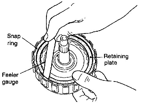 7. Measure clearance between retaining plate and snap ring. If not within allowable limit, select proper retaining plate.