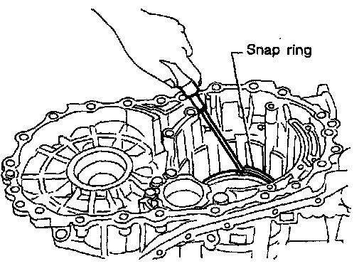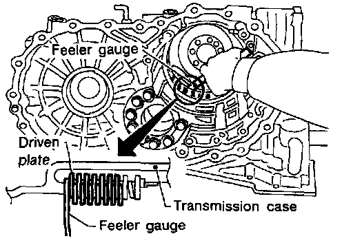 5. Measure clearance between driven plate and transmission case. It not within allowable limit, select proper retaining plate. (front side)