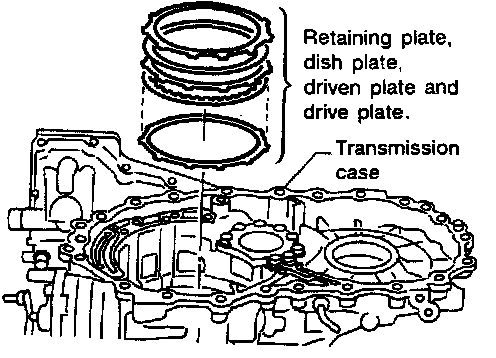 3. Remove dish plate, retaining plate, drive plates and driven plates from transmission case.
