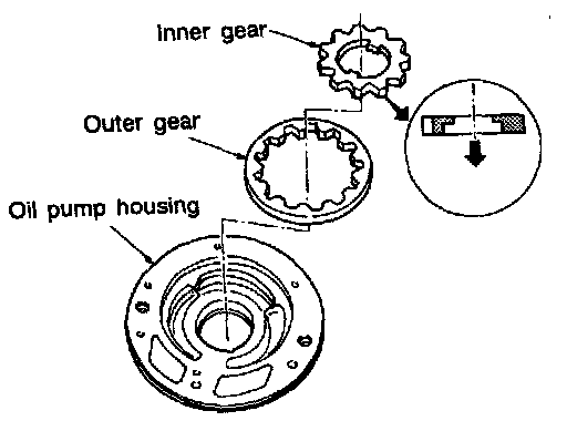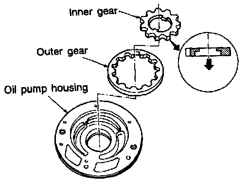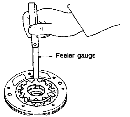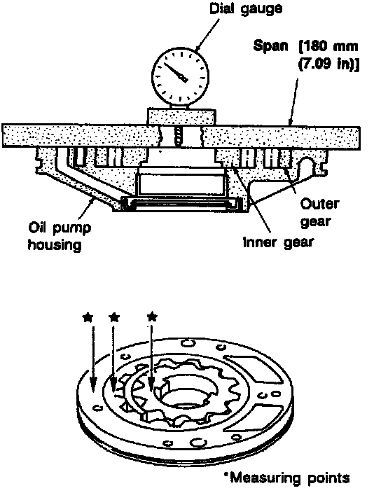 - Measure side clearance between end of oil pump housing and inner and outer gears in at least four places along their circumferences. Maximum measured values should be within specified ranges.
