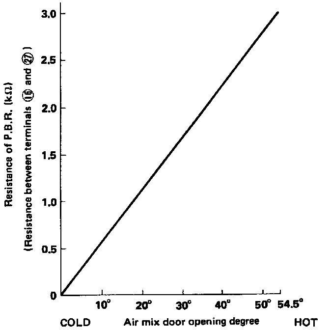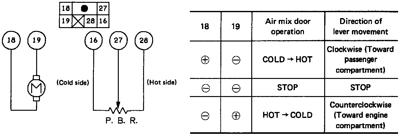 Test the Potentio Balance Resistor (PBR) integrally with the Air Mix Door Motor. Apply power and ground to pins 18 and 19 of the motor connector as shown in the illustration and measure the resistance of the PBR across pins 16 and 27.