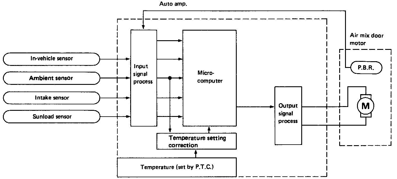 The temperature set by the Potentio Temp Control (PTC) is compensated through temperature setting correction circuitry. The Auto Amplifier will operate the Air Mix Door Motor to set HOT or COLD positions based on input from Sunload, In-Vehicle Temp., and Ambient Temp. Sensors.