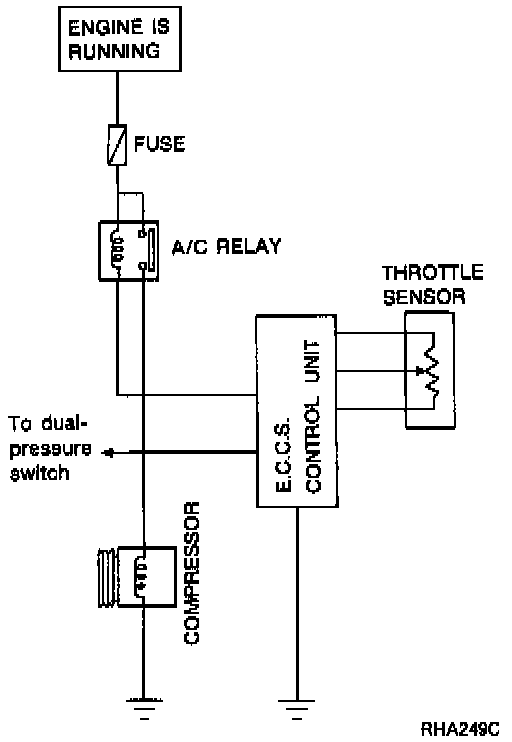 This system is controlled by the Electronic Concentrated Control System (ECCS) control unit. When the engine is heavily overloaded, the compressor is turned off for several seconds to reduce overloading.