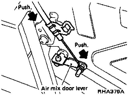 Clamp the cable while pushing cable outer and air mix door lever in direction of arrow.