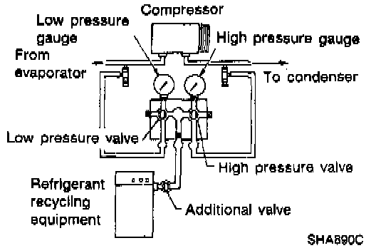 1. Connect vacuum hose to refrigerant recycling equipment and open additional valve and adapter valves.