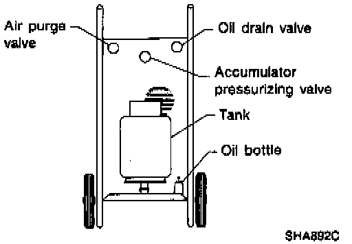 6. To drain A/C system oil accumulator, open "Accumulator Pressurizing" valve for approximately 15 seconds to allow some compressor discharge pressure back into accumulator. Close "Accumulator Pressurizing" valve and open "Oi1 Drain" valve slowly and drain accumulator. Do not allow accumulator to completely depressurize. When oil stops draining, close "Oil Drain" valve. Be sure to replace oil in A/C system before servicing.