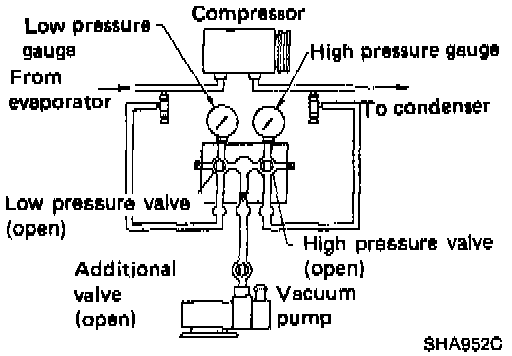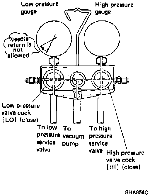 1. Shutoff high and low pressure valves and additional valve, and leave the system as it is for 5 to 10 minutes.