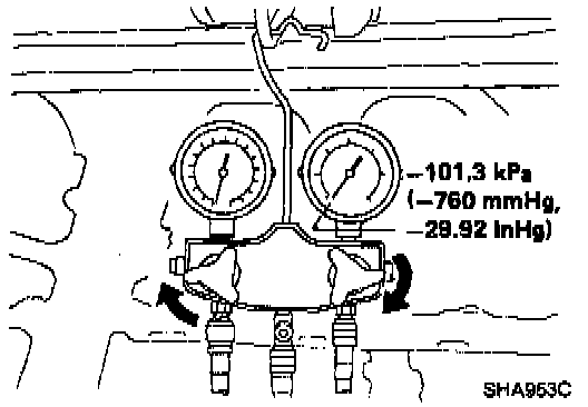 4. Perform evacuation for more than five minutes to stabilize the vacuum inside the system. Check to ensure that the low pressure gauge indicates -98.6 to -101.3 kPa (-740 to -760 mmHg, -29.13 to -29.92 in HG).
