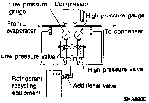 1. Completely loosen adapter valves of low pressure and high pressure lines.