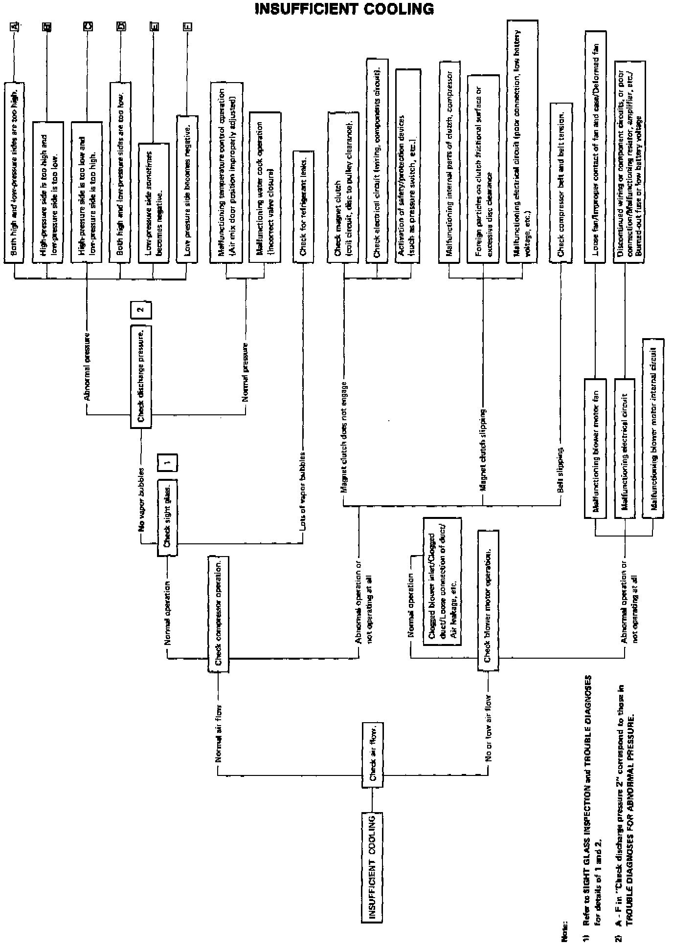 Whenever abnormal pressure of high and/or low sides of the system is noted, diagnosis must be conducted by using a manifold gauge. The large-line zone on the gauge scale (see illustrations.) shown in the following table refers to the standard (normal) pressure range for the corresponding pressure side (high or low). Since the standard (normal) pressure, however, differs from vehicle to vehicle, refer to the "Ambient Temperature-Pressure Characteristics" chart. Overall Performance Test, Overall System