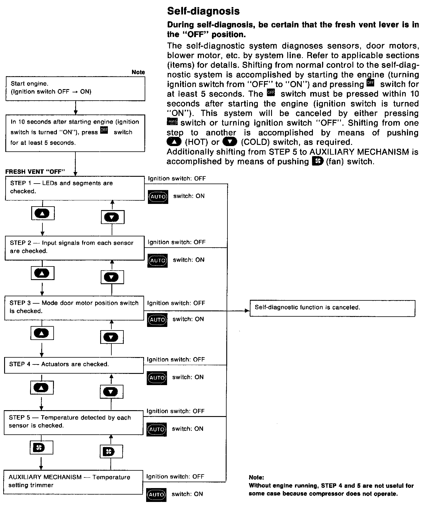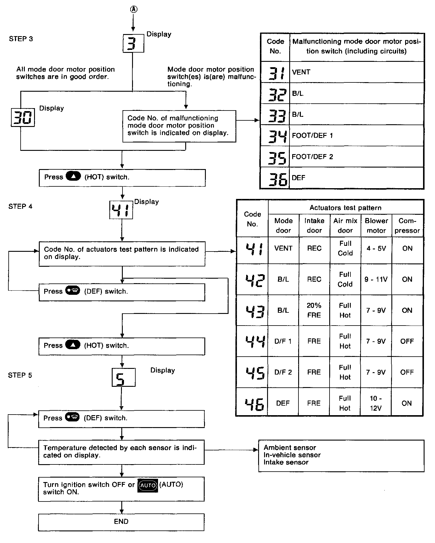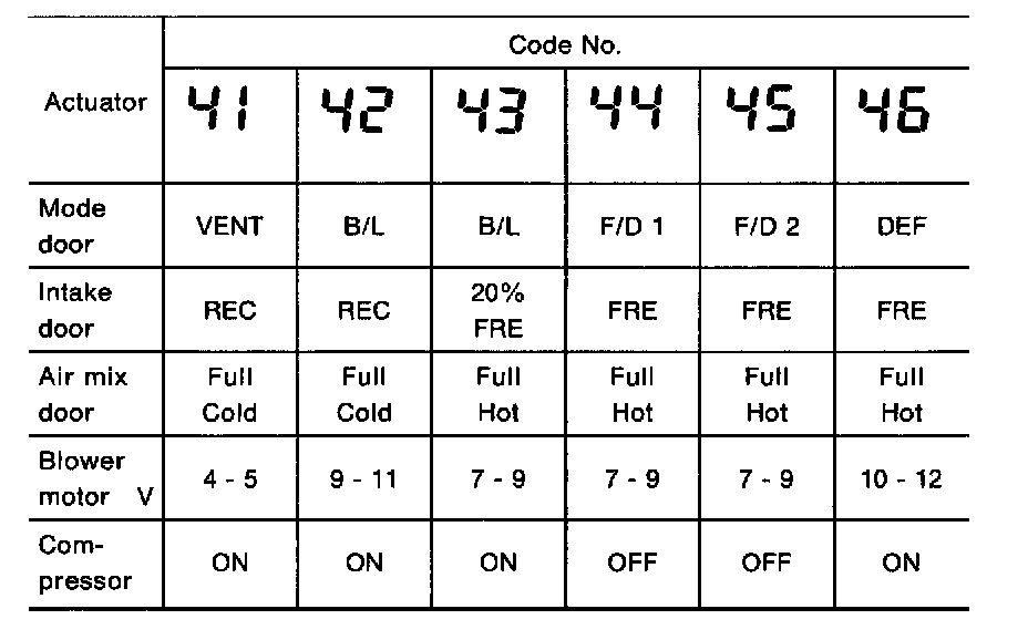 - During inspection in STEP 4 mode, be certain that the fresh vent lever is in the "OFF" position. The auto amplifier will forcefully transmit an output to the affected actuators in response to code No. shown on display, as indicated in table below.