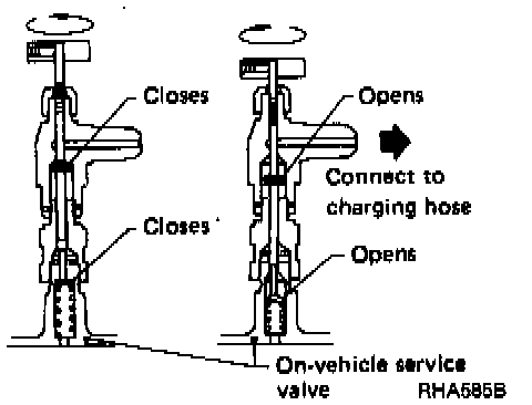 Turning the handle counterclockwise will close the passage. Before removing the adapter valve from the on-vehicle service valve, be sure to fully turn the handle counterclockwise to shut oft the refrigerant passage.