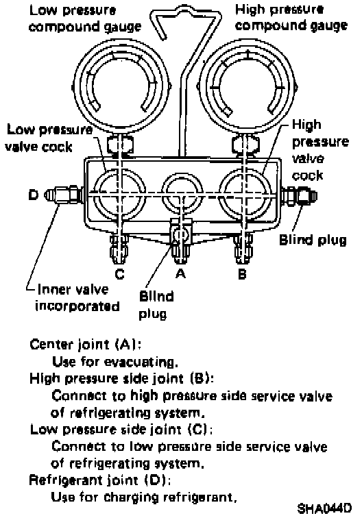 The manifold gauge is used to measure the operating pressure accurately in the high pressure and low pressure lines of the refrigerating system.