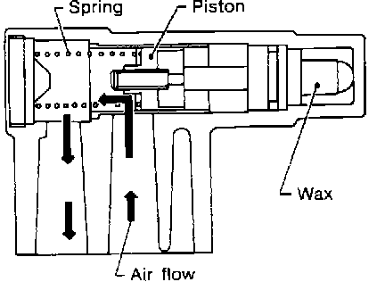 The intake collector mounted air regulator is used to provide a cold fast idle. Cooling system fluid circulates through the air regulator, warming a wax pellet. When coolant temperature is low, opposing spring pressure forces the piston back. With the piston retracted air is allowed to bypass the throttle plate to achieve a faster cold idle. As coolant temperature rises the was begins to expand, closing the bypass passage and returning the idle to normal curb speed.