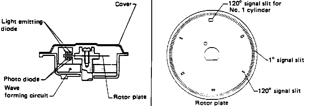 When the rotor passes between the photo diodes and LED's the slits in the rotor plate cut the light being transmitted to the photo diode from the LED. This generates pulses which are changed into ON/OFF signals by the wave forming circuit. The Engine Control Module (ECM) interprets these signals to calculate engine rpm and cylinder position.