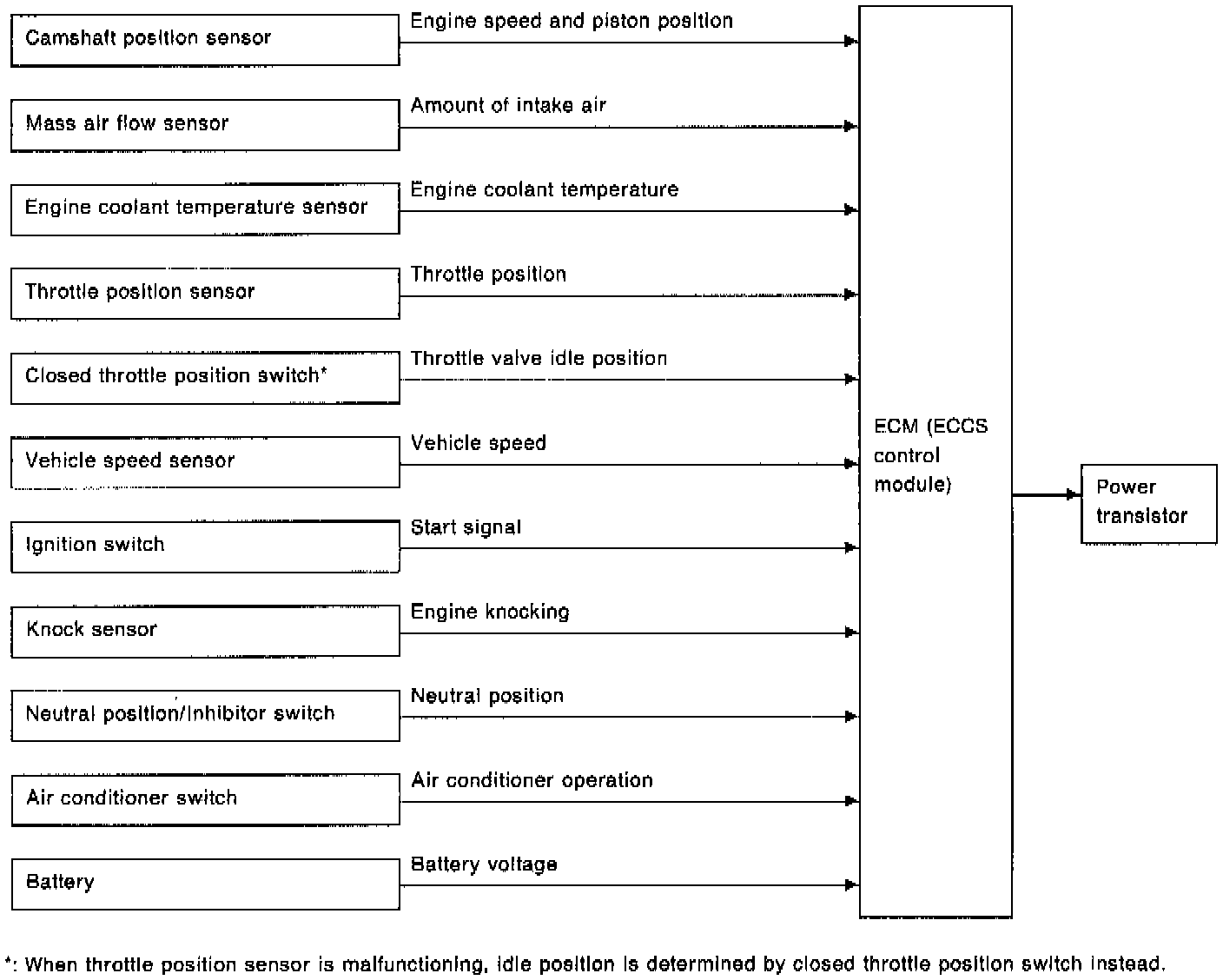 The ECM detects information such as the injection pulse width and camshaft position sensor signal which varies every moment. Then responding to this information, ignition signals are transmitted to the power transistor.