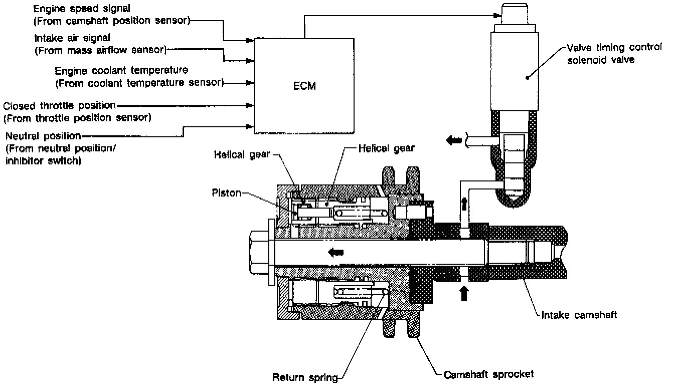 The valve timing control system is used to improve engine performance by dynamically changing intake cam timing.