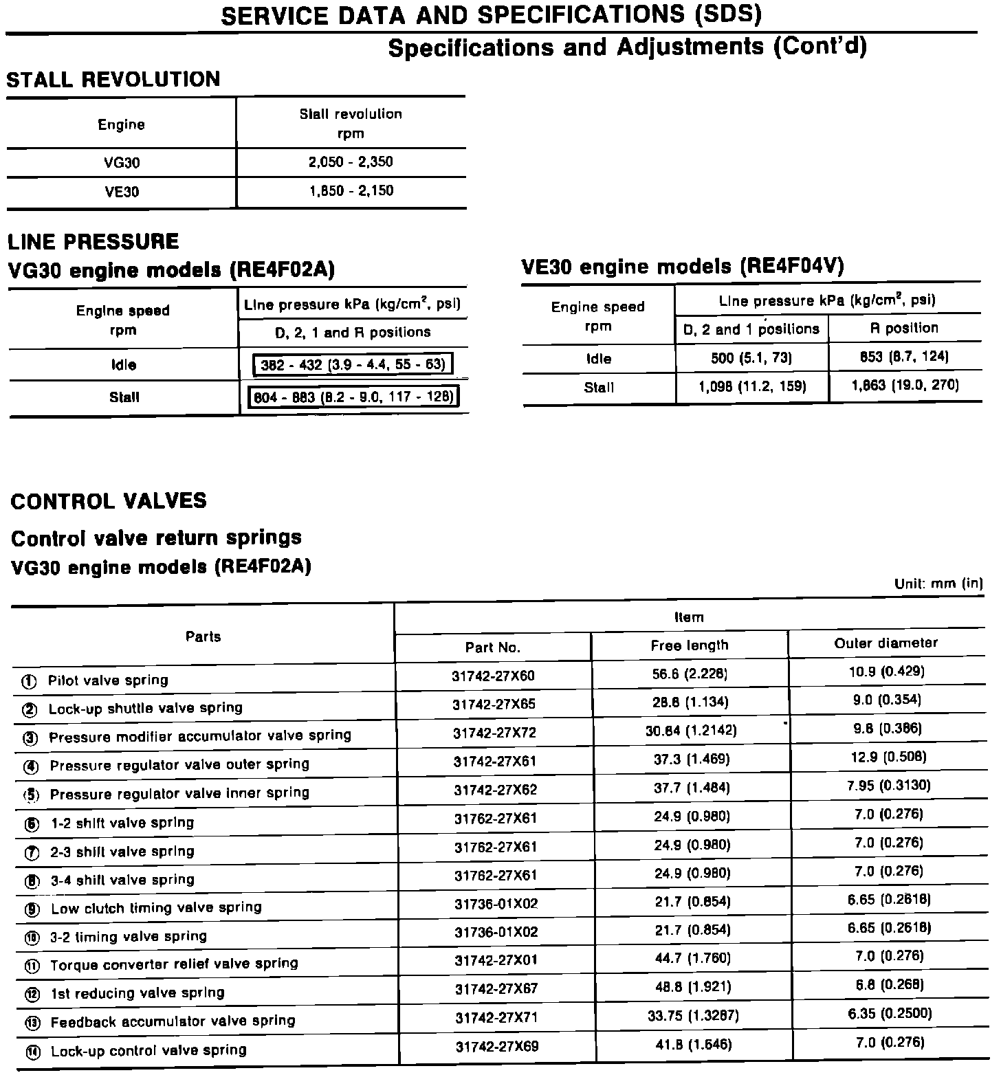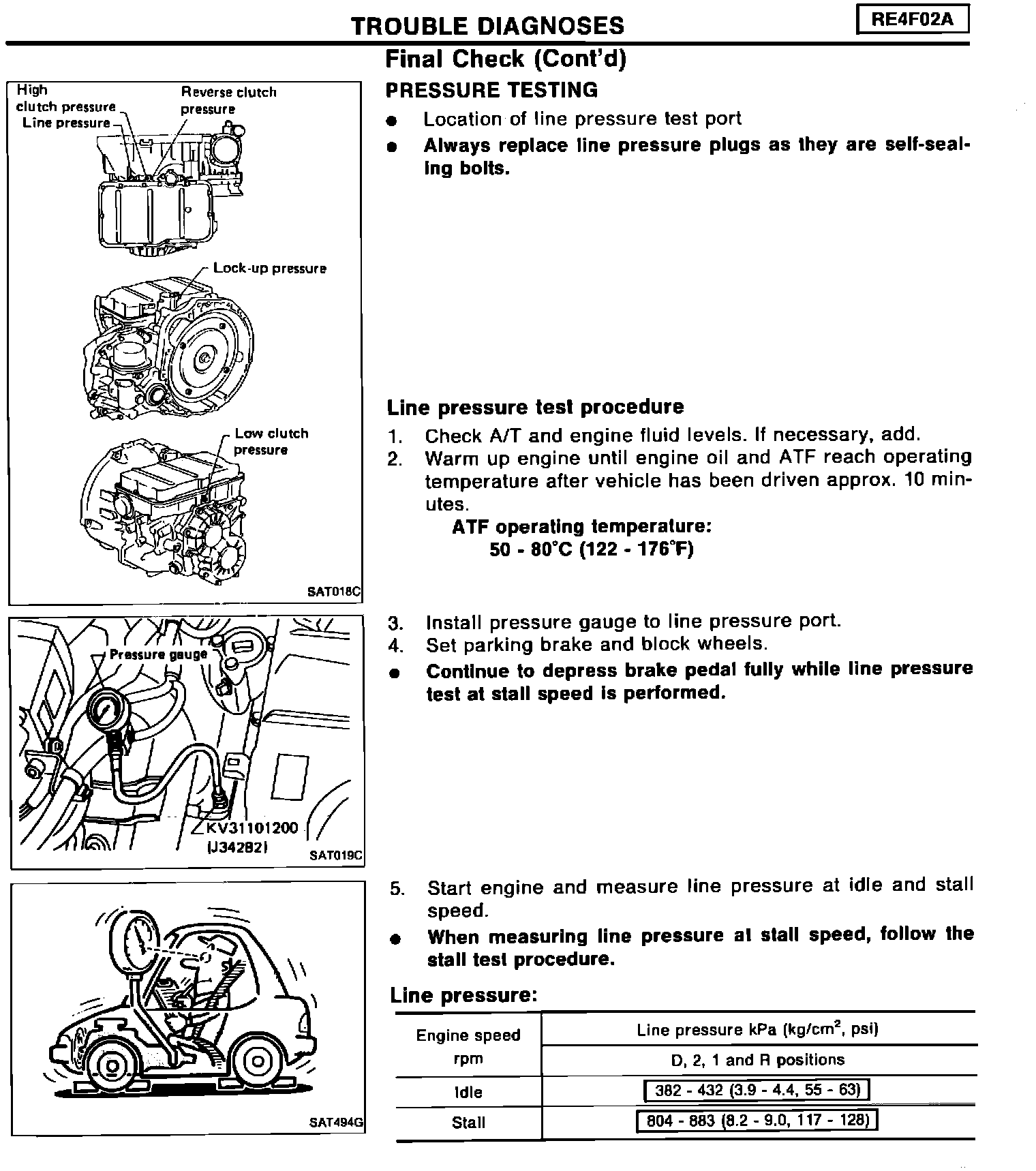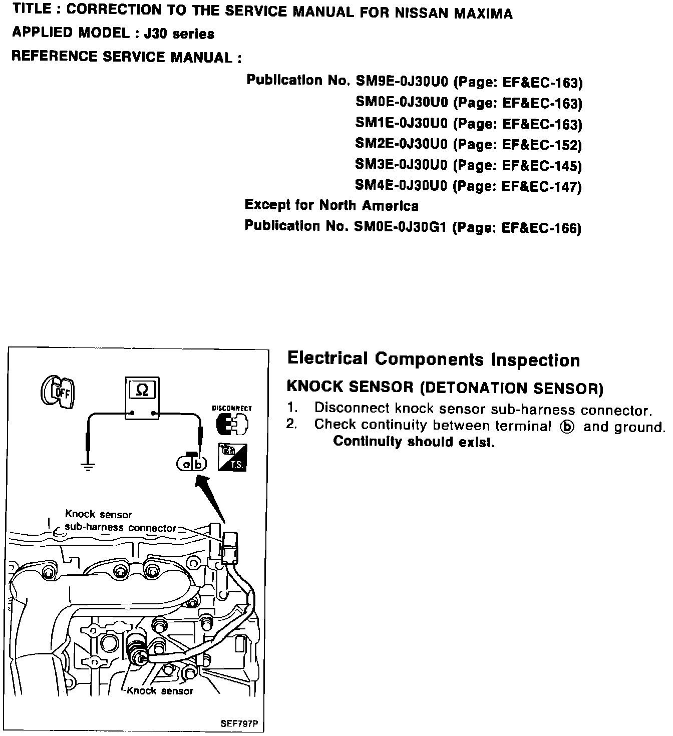 The illustrations for the EF & EC and Automatic Transmission sections of the 1994 Maxima service manual contain the following corrections for the Knock sensor inspection and line pressure testing of the RE4FO2A transmission. Please paste the amended pages in your copies of the 1994 Maxima Service Manual and make the correction of the Knock sensor inspection by hand.