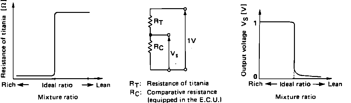 The titania in the sensor changes it's electrical resistance drastically at the moment the "ideal" air-fuel ratio is achieved. When the Engine Control Module (ECM) reads a change from the source voltage, the fuel injector pulse width will be modified accordingly.