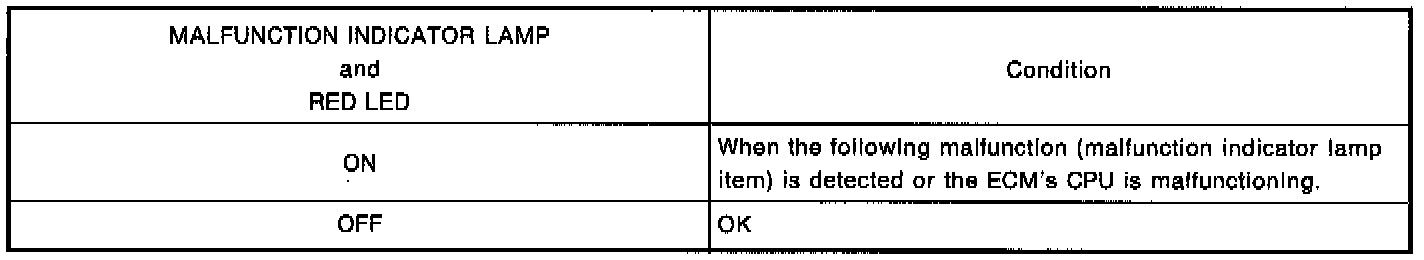 In this mode, the RED LED in the Engine Control Module (ECM) and the MALFUNCTION INDICATOR LAMP in the instrument panel stay "ON". If either remain "OFF", check the bulb in the MALFUNCTION INDICATOR LAMP or the RED LED.