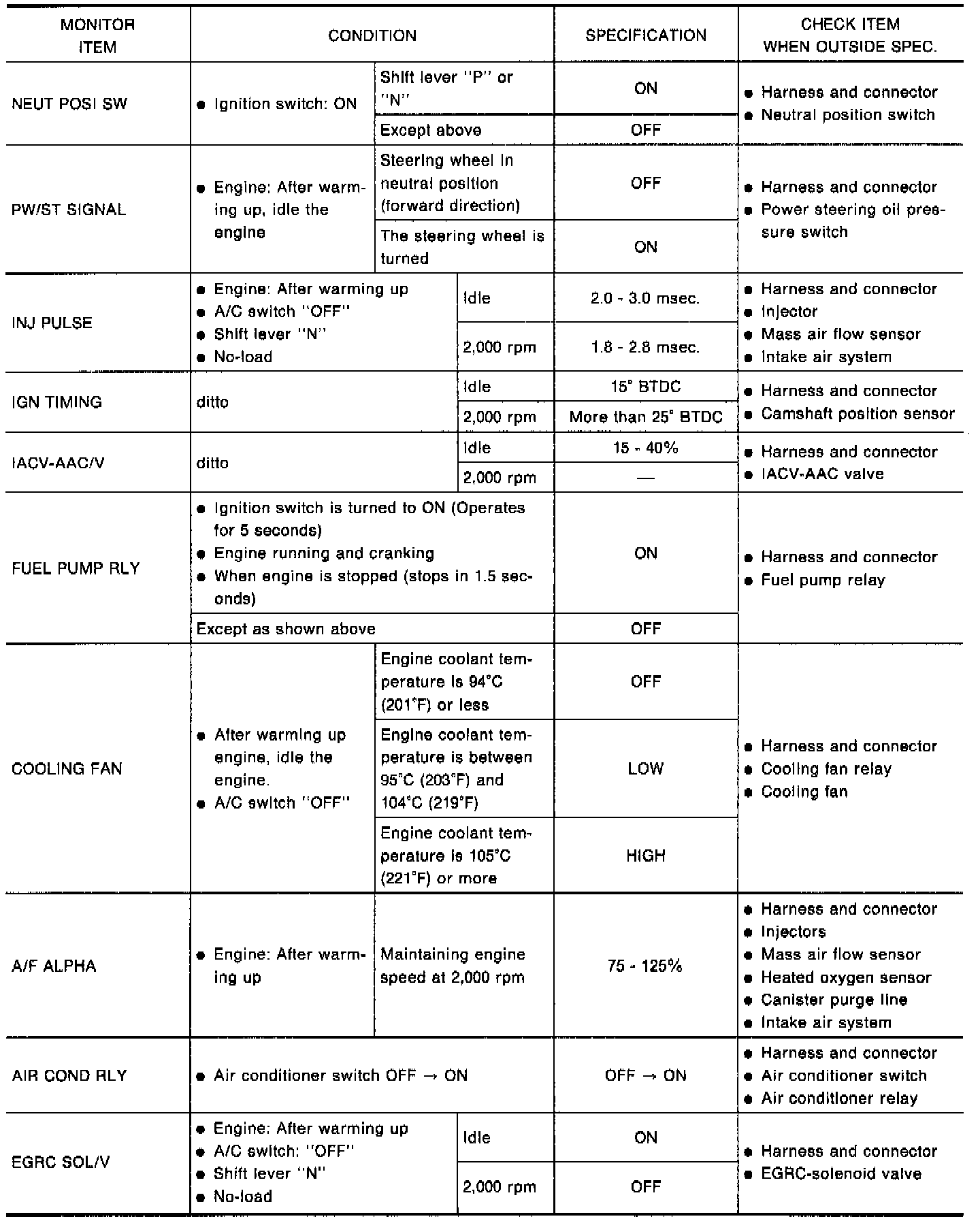 ^ Adjust ignition timing with a timing light before monitoring IGN TIMING, because the monitor may show the specification data in spite of the ignition timing being not adjusted to the specification data. This IGN TIMING monitors the calculated data by ECM according to the input signals from camshaft position sensor and other ignition timing related sensors.