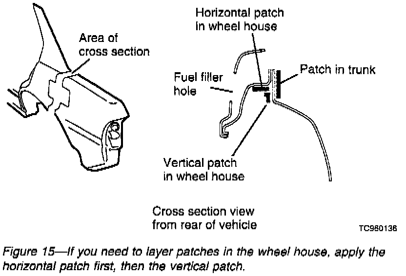 5. If you need to layer patches in the outer wheel house area around the fuel filler hole, the order of patch installation must be (see Figure 15):