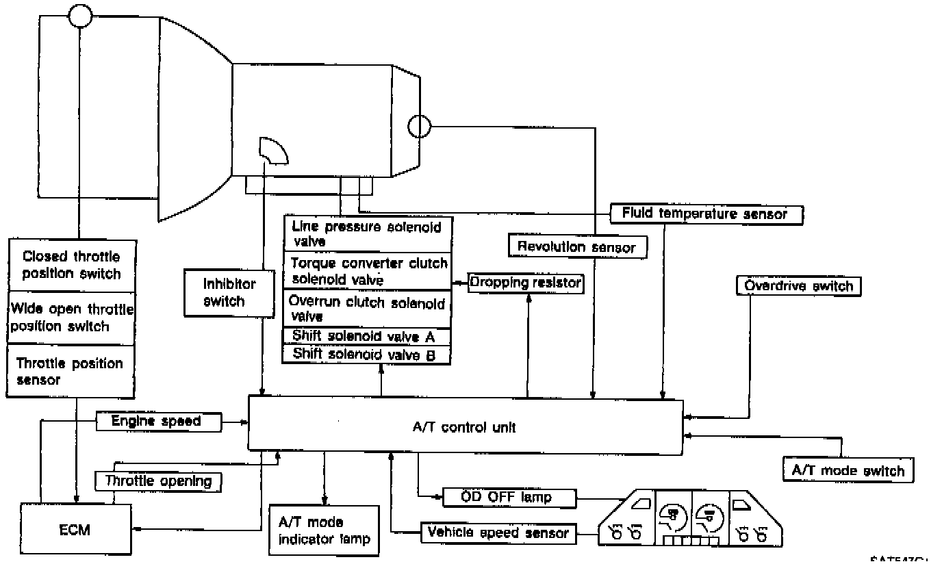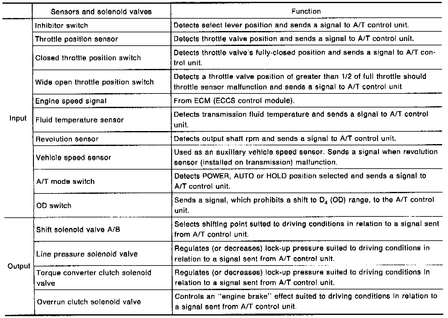 The A/T control unit receives signals sent from various switches and sensors, determines required line pressure, shifting point, lock-up operation, engine brake operation, and sends required signals to the respective solenoids.