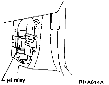 The Hi Relay is located on the intake unit, behind the right side kick panel. It receives a signal from the auto amplifier to operate the blower motor at high speed.
