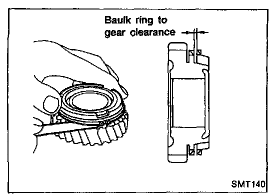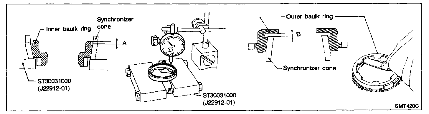 b. While holding baulk ring against synchronizer cone as far as it will go, measure dimensions "A" and "B".