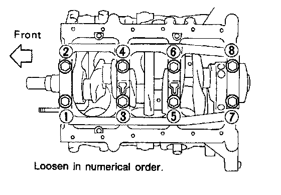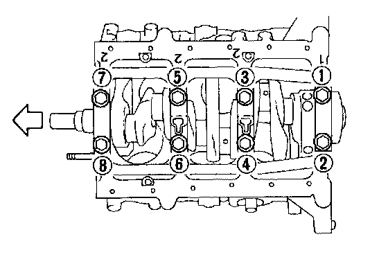 ^ Tighten bearing cap bolts gradually in two or three stages. Start with center bearing and move outward sequentially.