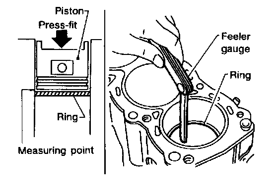 If out of specification, replace piston ring. If gap still exceeds the limit even with a new ring, rebore cylinder and use oversized piston and piston rings. When replacing the piston, check the cylinder block surface for scratches or seizure. If scratches or seizure is found, hone or replace the cylinder block.