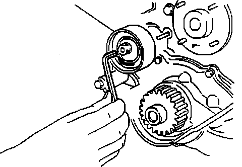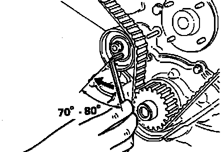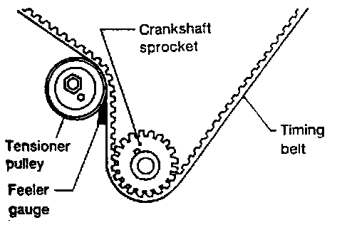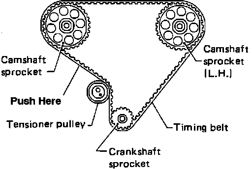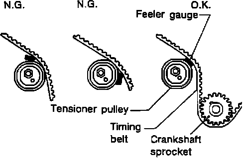 8. Push middle of timing belt between R.H. camshaft sprocket and tensioner pulley with force of 98 N (10 kg, 22 lb).