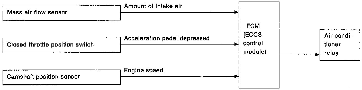The acceleration cut control (ACC) system is used to improve engine operation by disengaging the A/C compressor when the throttle valve is at wide open throttle (WOT).