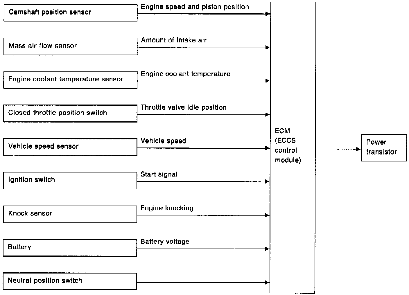 The ECM detects information such as the injection pulse width and camshaft position sensor signal which varies every moment. Then responding to this information, ignition signals are transmitted to the power transistor.