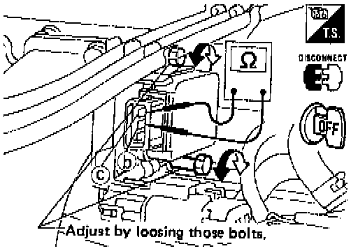 7. If NG, set closed throttle position switch OFF ON speed to the specified value by turning throttle position sensor body. Connect circuit tester with terminals (c) and (b) on closed throttle position switch side and find out OFF ON point.