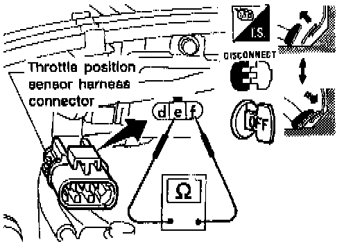 2. Make sure that resistance between terminals (e) and (f) changes when opening throttle valve manually.