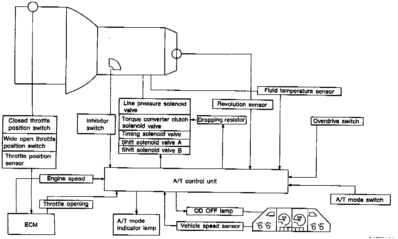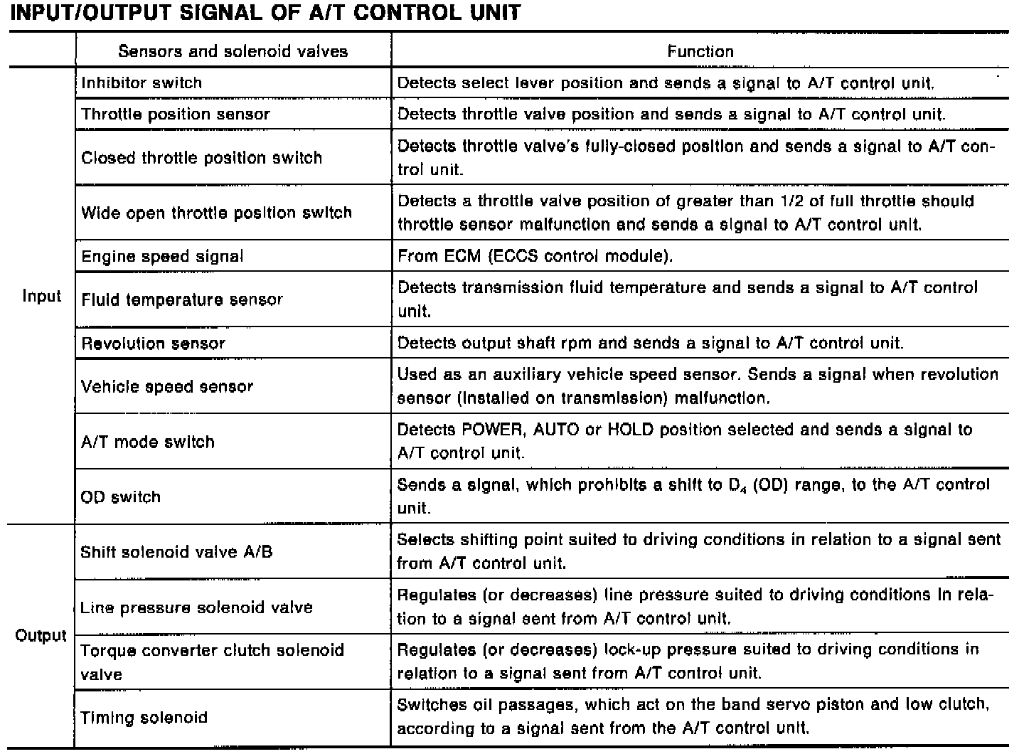 The A/T control unit receives signals sent from various switches and sensors, determines required line pressure, shifting point, lock-up operation, engine brake operation, and sends required signals to the respective solenoids.