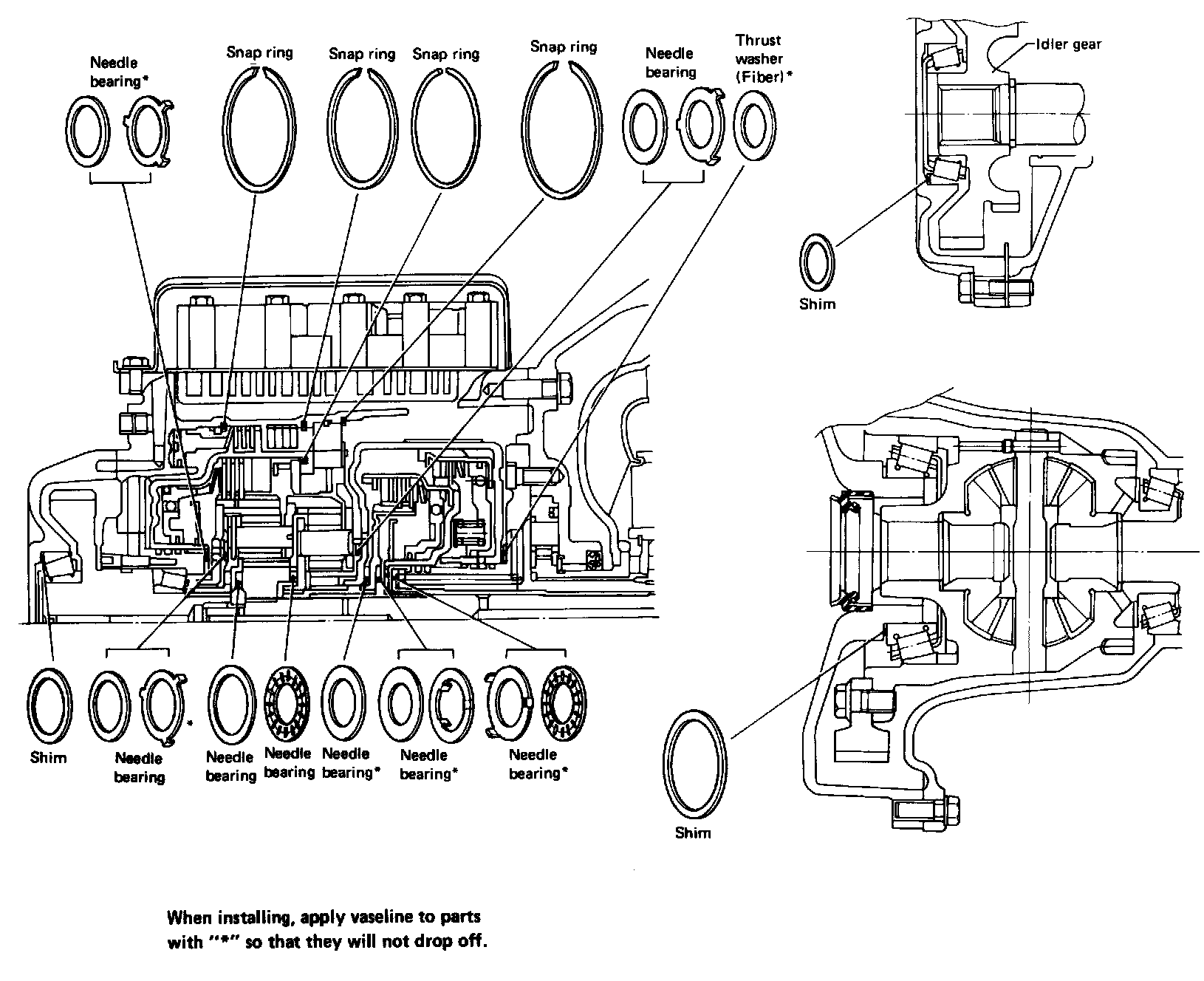 When installing/assembling needle bearing and bearing race, use the following illustrations as a guide to installation procedures and locations.