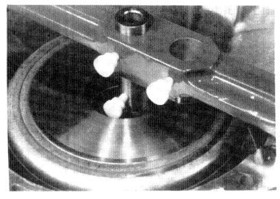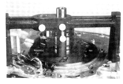 c. Place Tools (bridge and gauging cylinder) on machined gasket surface of converter housing. Allow gauging cylinder to rest on needle bearing and lock it in place with thumbscrew.