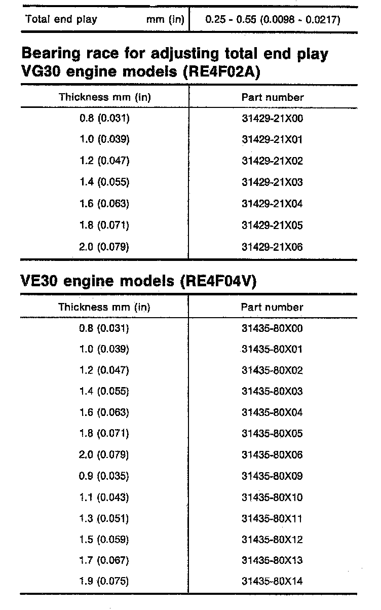 g. Use your feeler gauge reading to select appropriate bearing race thickness from following chart: