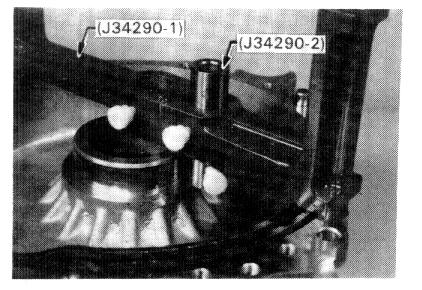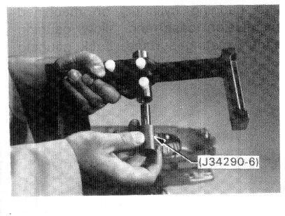 f. Place bridge, gauging cylinder, and gauging plunger onto machined gasket surface of converter housing and allow gauging plunger to rest on surface of bearing inner cone. Lock plunger in place.